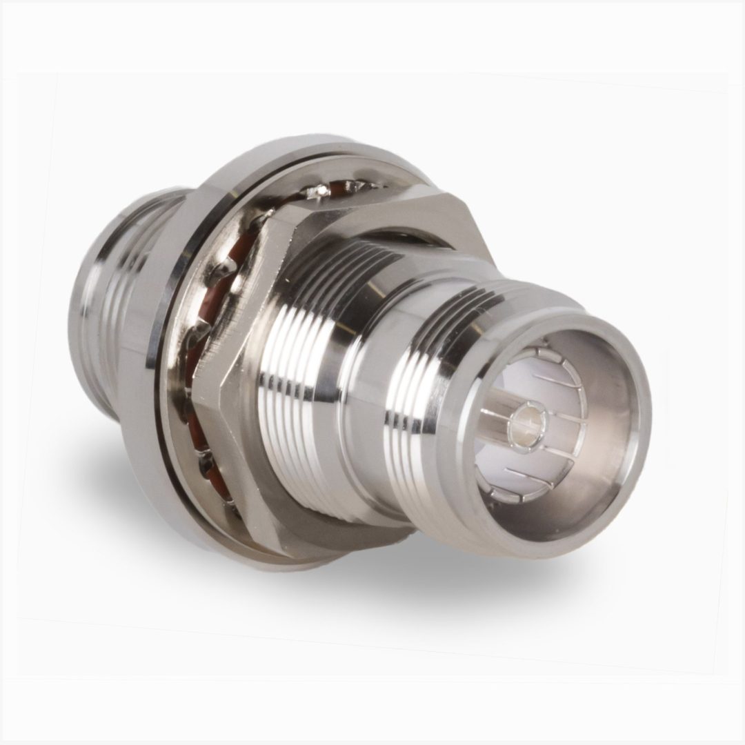Adaptador pasamuro 4.3/10 hembra a hembra, facilita la conexión entre equipos que de otra manera no serían compatibles debido a sus conectores RF distintos.